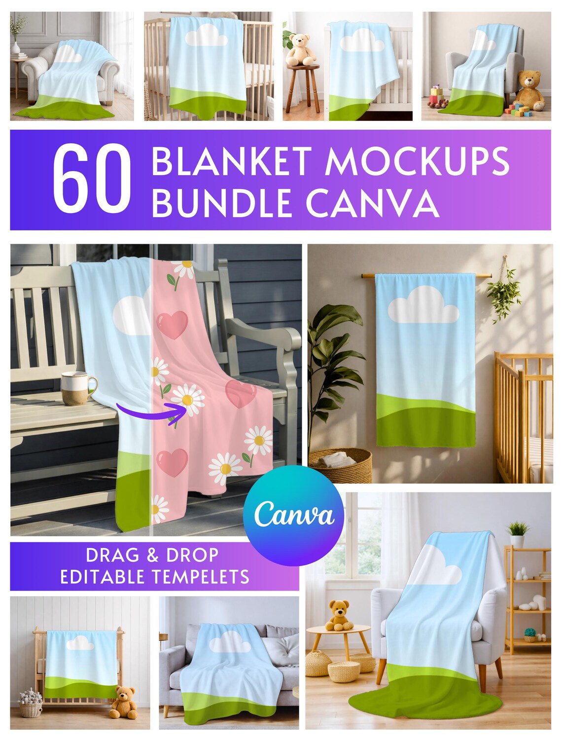 ✨ 60 Blanket Mockups Canva Template Bundle – Editable White Blanket Mockup Pack ✨