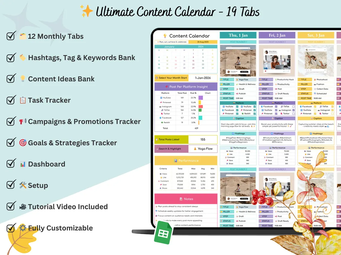 Effortlessly plan, track, and organize posts across multiple platforms with a sleek, editable interface. This all-in-one content calendar is perfect for scheduling posts, tracking hashtags, running campaigns, setting goals, analyzing reports, and keeping your strategy on point. β