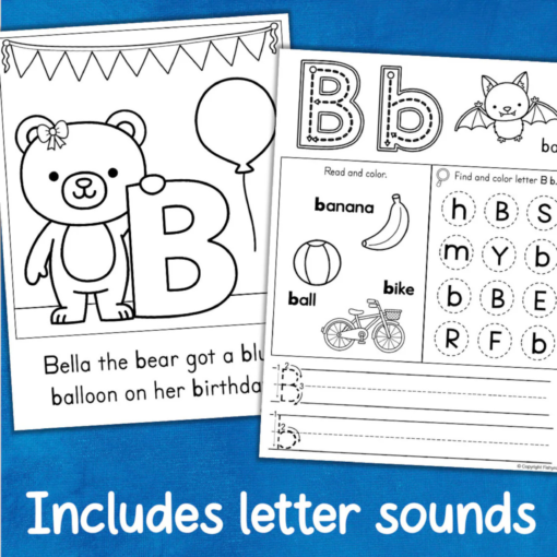 • Letter sound coloring page – fun picture showing words that start with that letter sound plus a sentence to read